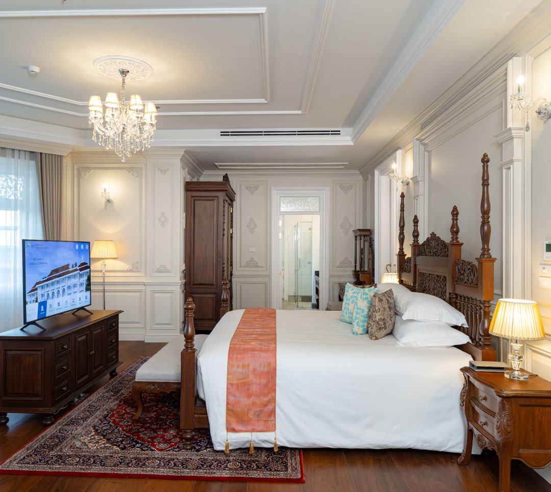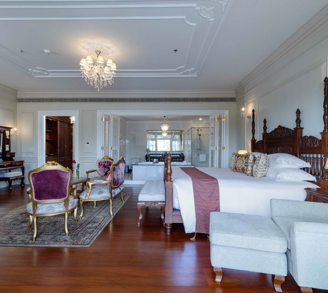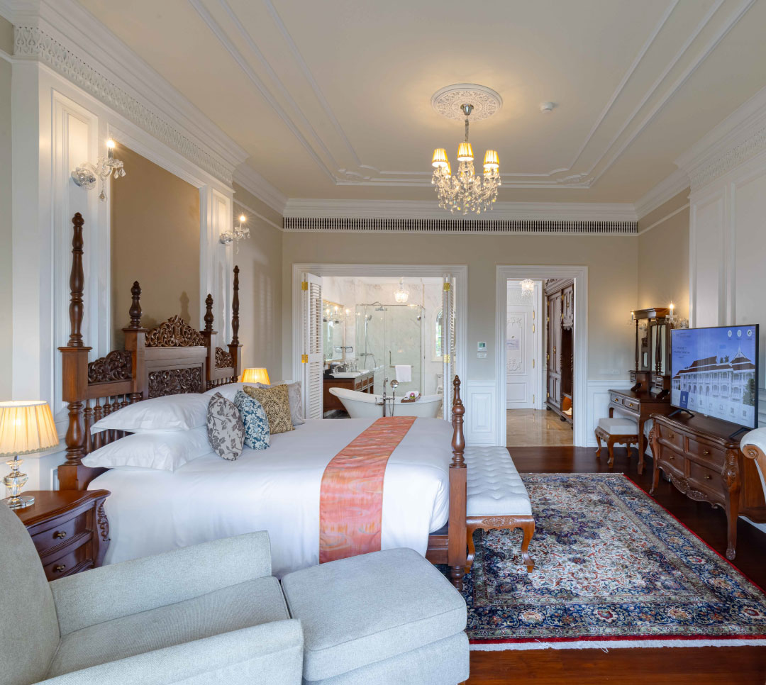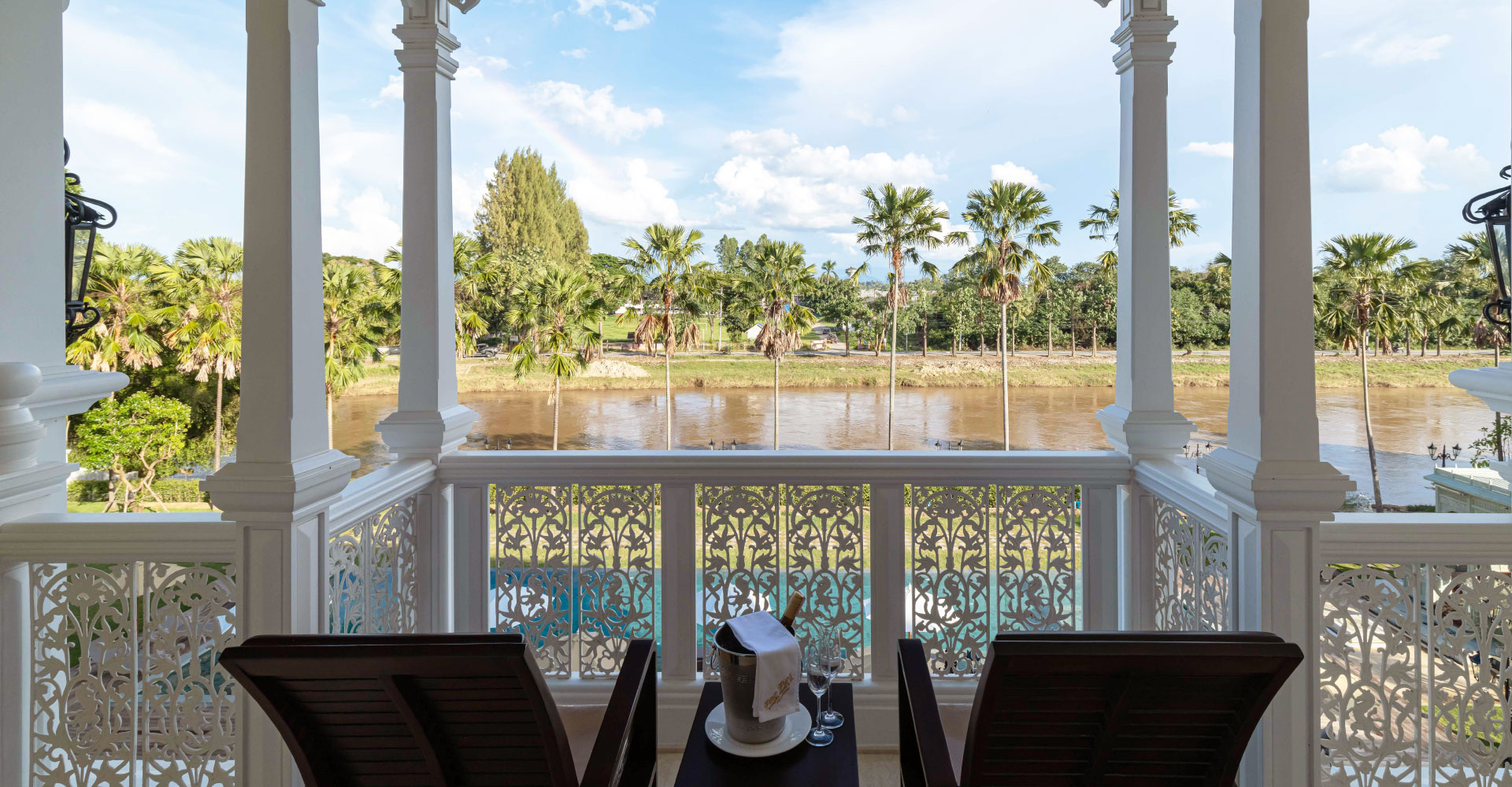 The Junior Suite offers 130 sqm of refined luxury, featuring a spacious bedroom, elegant living room, and private minibar with a wine cooler. The lavish bathroom includes a Jacuzzi bathtub for a spa-like retreat, while the extended balcony reveals panoramic views of the serene Ping River.